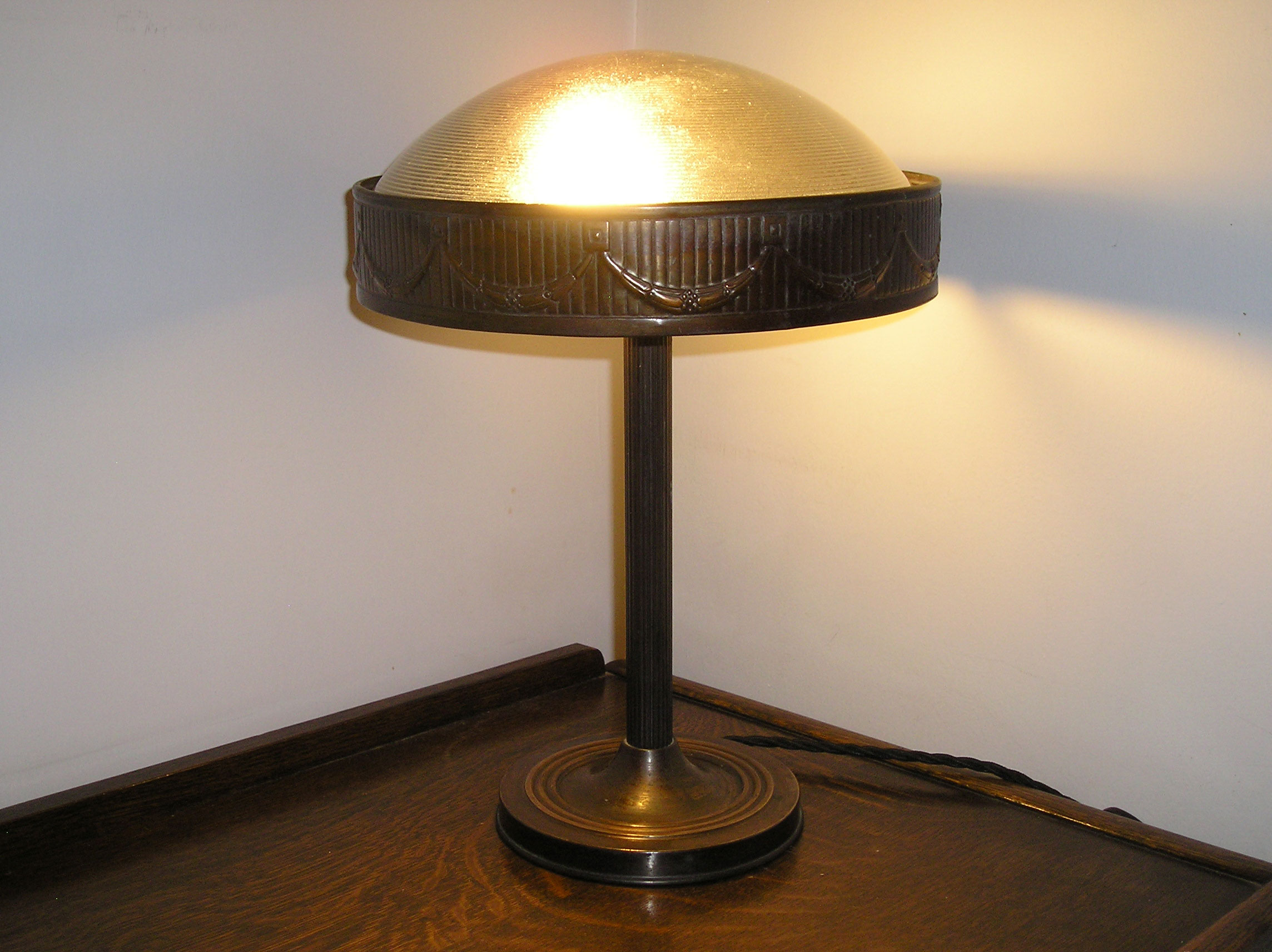 French Bronze and Glass Lamp August 31, 2018February 8, 2024 Written by 20thc_admin A French bronze and glass lamp with holophane shade.