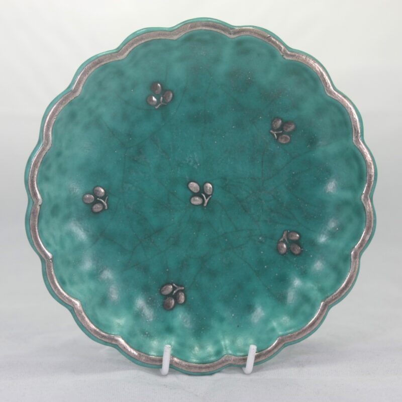 A vintage Gustavsberg Argenta 939 fluted pin dish in a mottled teal glaze with silver overlay.