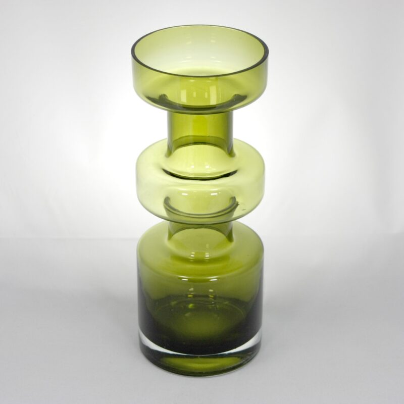 A vintage Riihimaki “Cog” vase in olive green glass encased in clear.